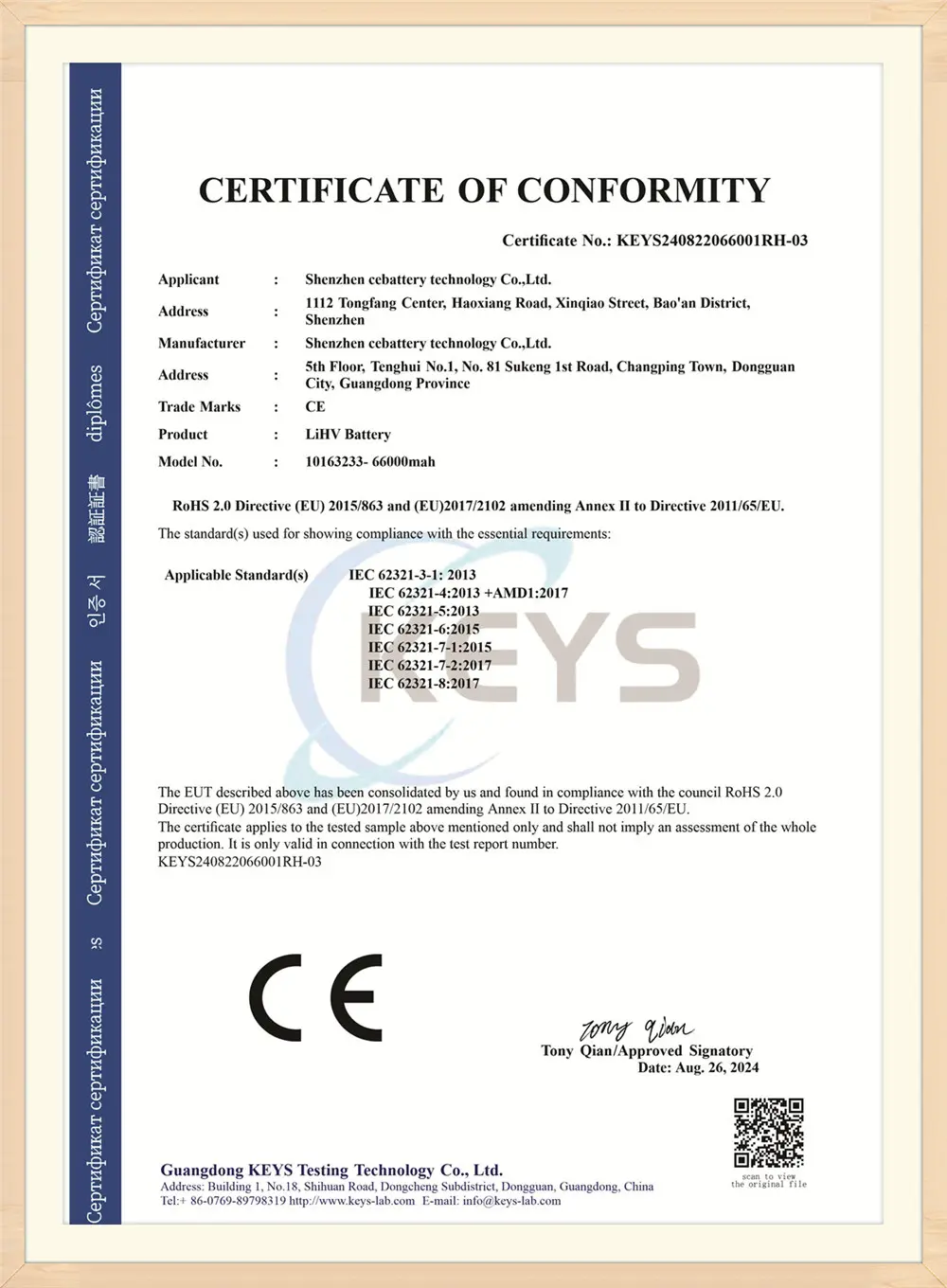 ZyebateteBeti "Kalitatearen kalitatea, zerbitzua, osotasuna mantentzeko promesak" negozioaren filosofia jarraitzen du. Bateriaren hornitzaile onena eta egonkorrena izan dadin, kalitate handiko bateriaren teknologia kargagarria da eta Zyebatete-k agintaritza ziurtagiri ugari eman ditu, esaterako, ISO9001: 2015, UL, CE, FCC, NBE, 3C, etab.